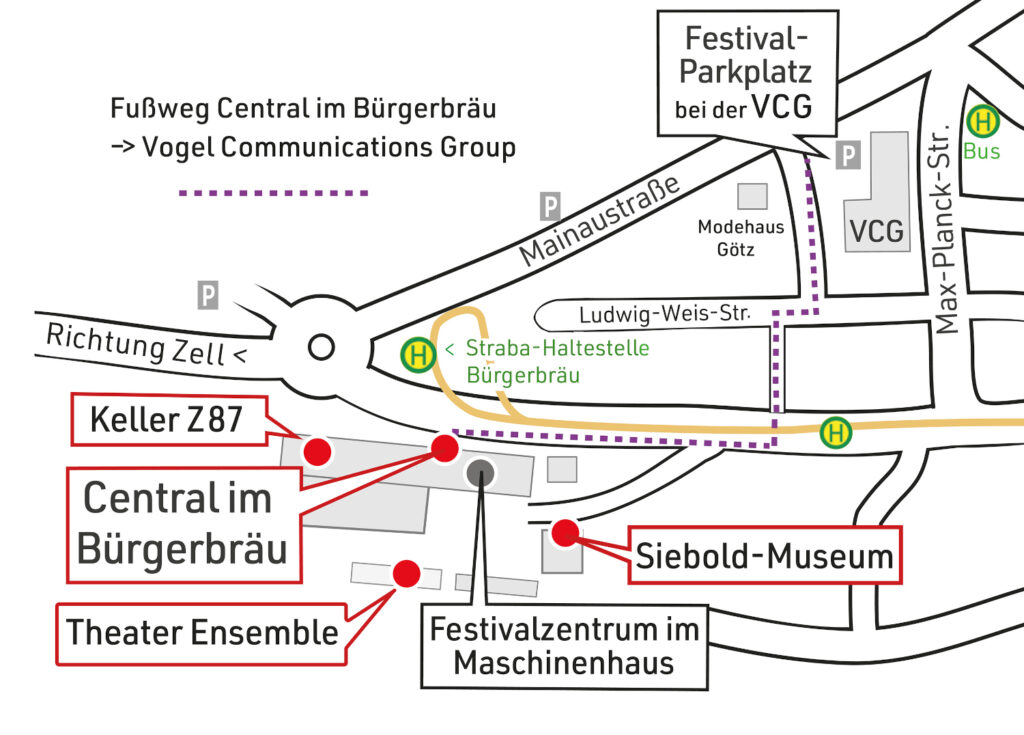Das Festival findet in den drei Kinosälen des Central im Bürgerbräu, im Siebold-Museum und im Keller Z87 statt. Das Maschinenhaus dient als Festivalzentrum mit Gastronomie. Alle genannten Orte befinden sich auf dem Bürgerbräugelände, Frankfurter Straße 87, 97082 Würzburg. Nutzt am besten öffentliche Verkehrsmittel (Haltestelle: Bürgerbräu). Der offizielle Festivalparkplatz befindet sich am Vogel Convention Center (Parkplatz P1), Max-Planck-Straße/Ecke Ludwig-Weis-Straße, 97082 Würzburg. Auf dem Bürgerbräugelände selbst gibt es nur begrenzte Parkmöglichkeiten. Die Räumlichkeiten des Central sind vollständig barrierefrei, das Gelände und die weiteren Spielstätten sind nur eingeschränkt barrierefrei. Dazu gerne Rücksprache halten mit unseren Kollegen vor Ort.
